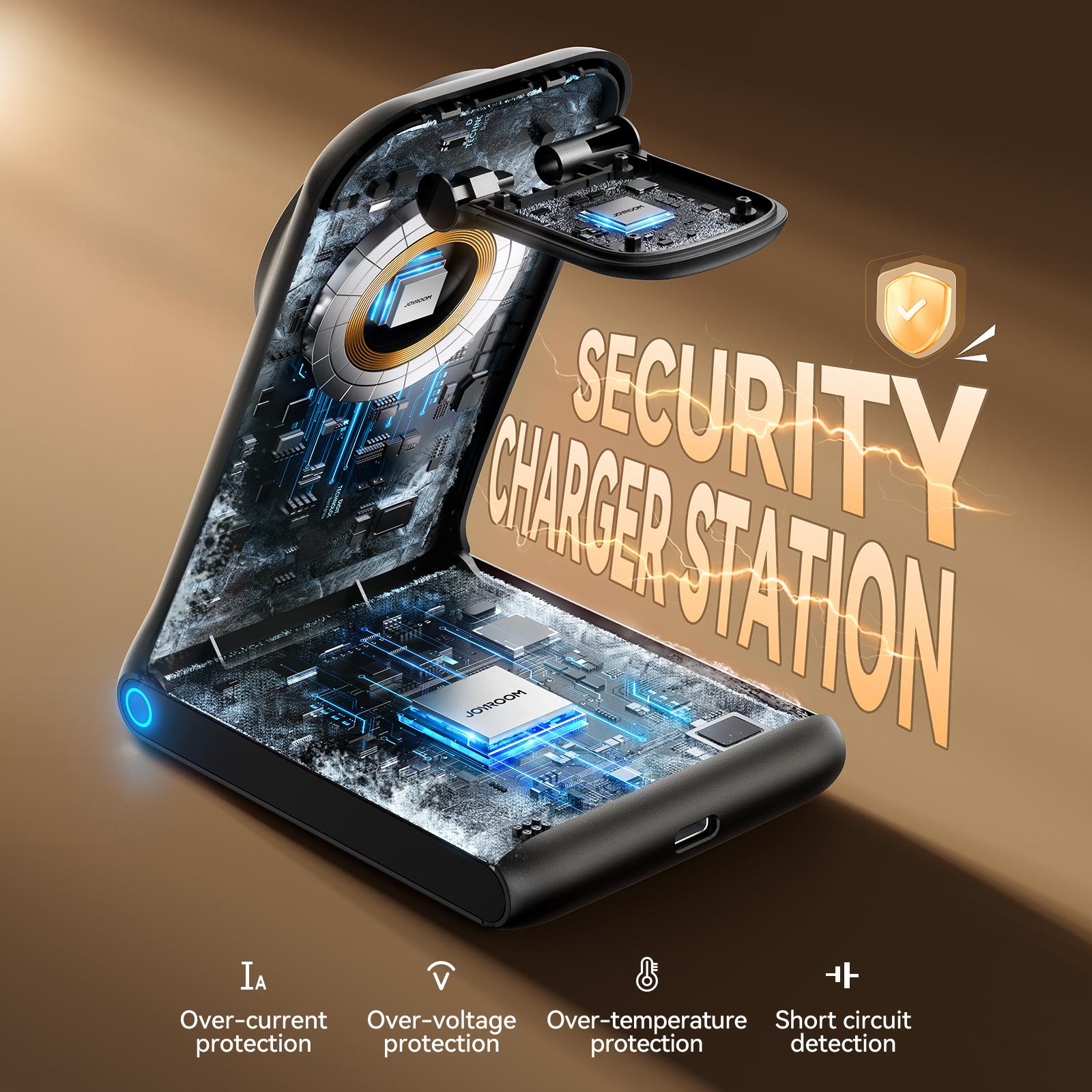 Get rid of tangled cables and enjoy wireless charging with Joyroom JR-W15, a 3-in-1 station ideal for office or home.