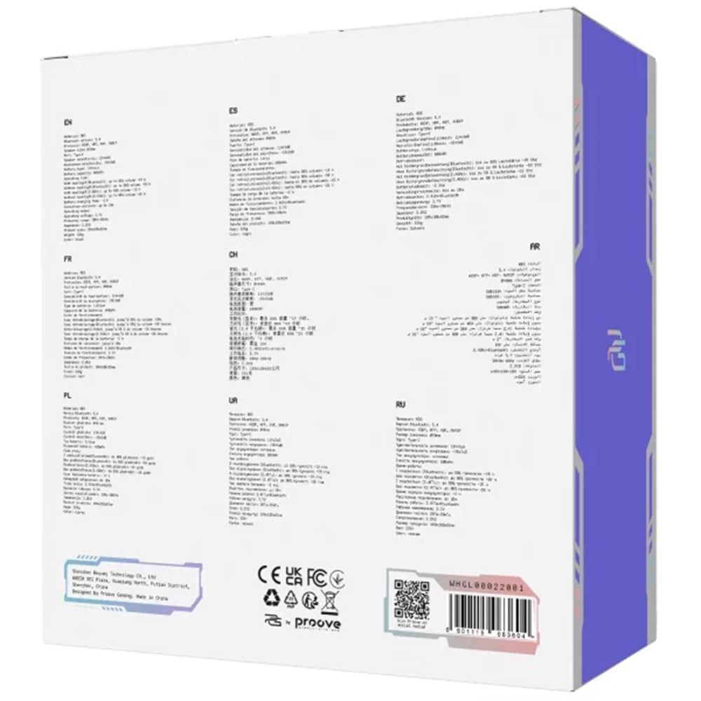 Proove headphones are designed for consistent performance, real comfort, and a balanced audio experience in everyday use. Immersive sound Proove headphones are equipped with 40mm speakers, designed for clear sound reproduction, deep bass, and precise audio positioning in games. Integrated microphone The high-sensitivity microphone clearly captures the voice and ensures stable transmission without noise or distortion. Specifications: Operating mode: 2.4GHz, Bluetooth; Charging port: Type-C; Bluetooth version: V5.4; Battery capacity: 900mAh; Battery type: lithium; Charging time: approx. 2 hours; Battery life with active lighting (vol. up to 80%): approx. 14 hours; Battery life without lighting (vol. up to 80%): 38-82 hours; Frequency: 20Hz - 20kHz; Impedance: 20 ± 2; Microphone sensitivity: -38 ± 3dB; Speaker sensitivity: 114 ± 3dB; Speaker size: Ø 40mm; Dimensions: 189 x 180 x 83; Weight: 226g; Bluetooth protocols: A2DP, HFP, AVRCP.