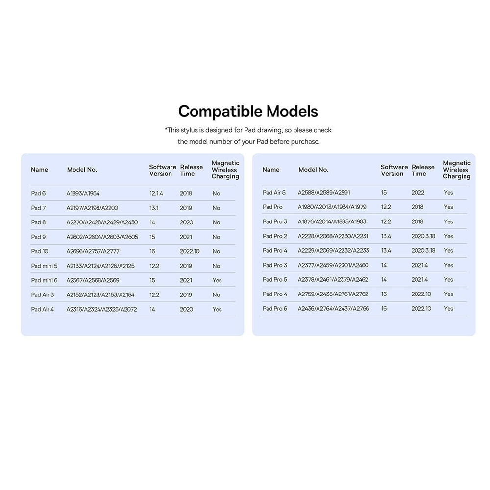 • Attention! The following tablets do not support magnetic charging: iPad 6 (2018), iPad 7 (2019), iPad 8 (2020), iPad 9 (2021), iPad10 (2022), iPad Air 3 (2019), iPad Mini 5 (2019).