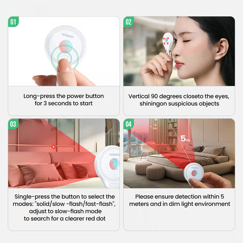 The Ugreen detector quickly identifies spy cameras and other hidden surveillance devices, providing safety in hotels or rented spaces.